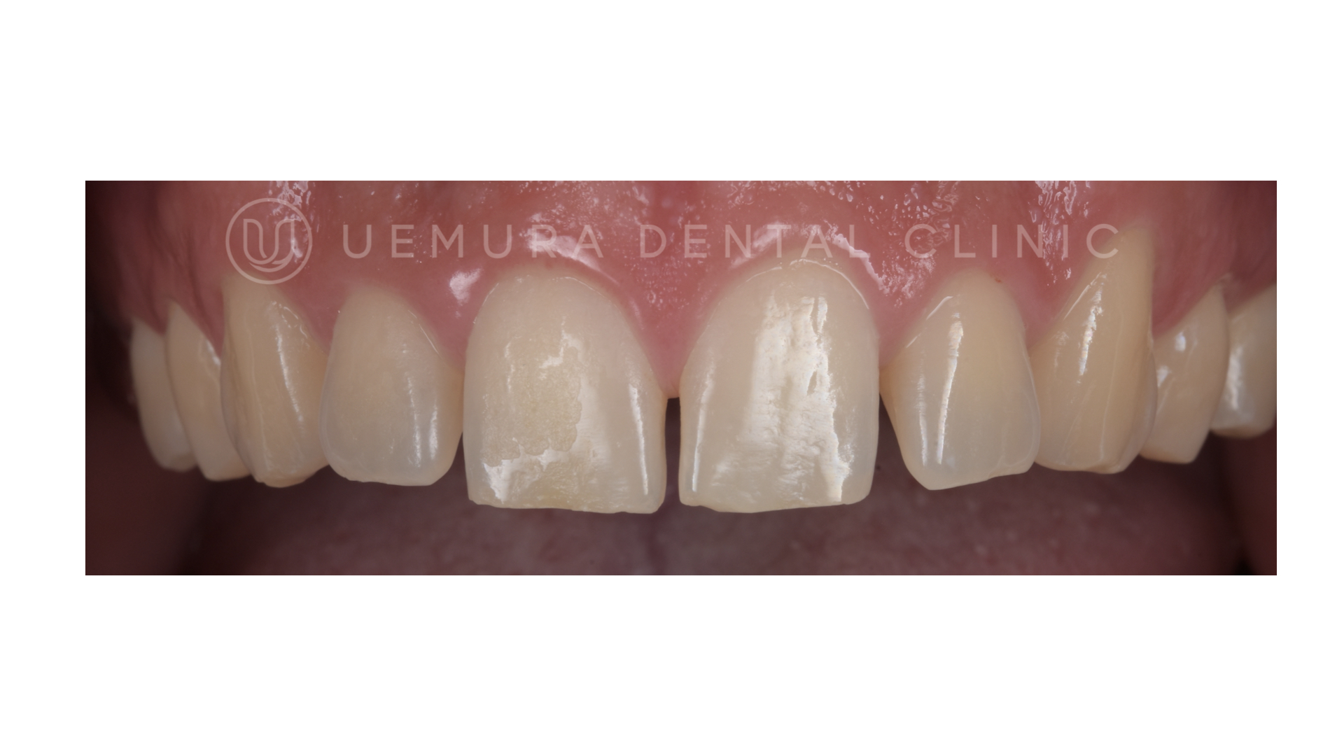 | 治療方法 | ラバーダム防湿を行い、適合の悪い修復物(白い詰め物)を除去。内部に虫歯を認めたため虫歯を除去し、エアフローを用いて徹底的に歯面の清掃を行なった。その後、ダイレクトボンディングを行なった。 |